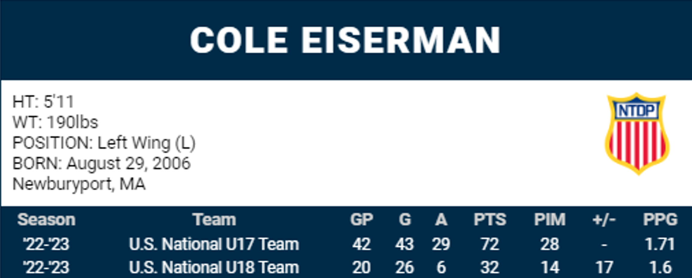 Scouting Report: Another high-end talent who has been developing at the USNTDP. He’s the next torch bearer for the program. Eiserman wants the puck on his stick every shift. He drives the play of whatever line he is on. He’s a goal scorer. Like any offensive talent at this stage of his development he needs to evolve to the point he can be trusted more defensively, but he’s immensely gifted offensively and will challenge Celebrini for first overall next summer.