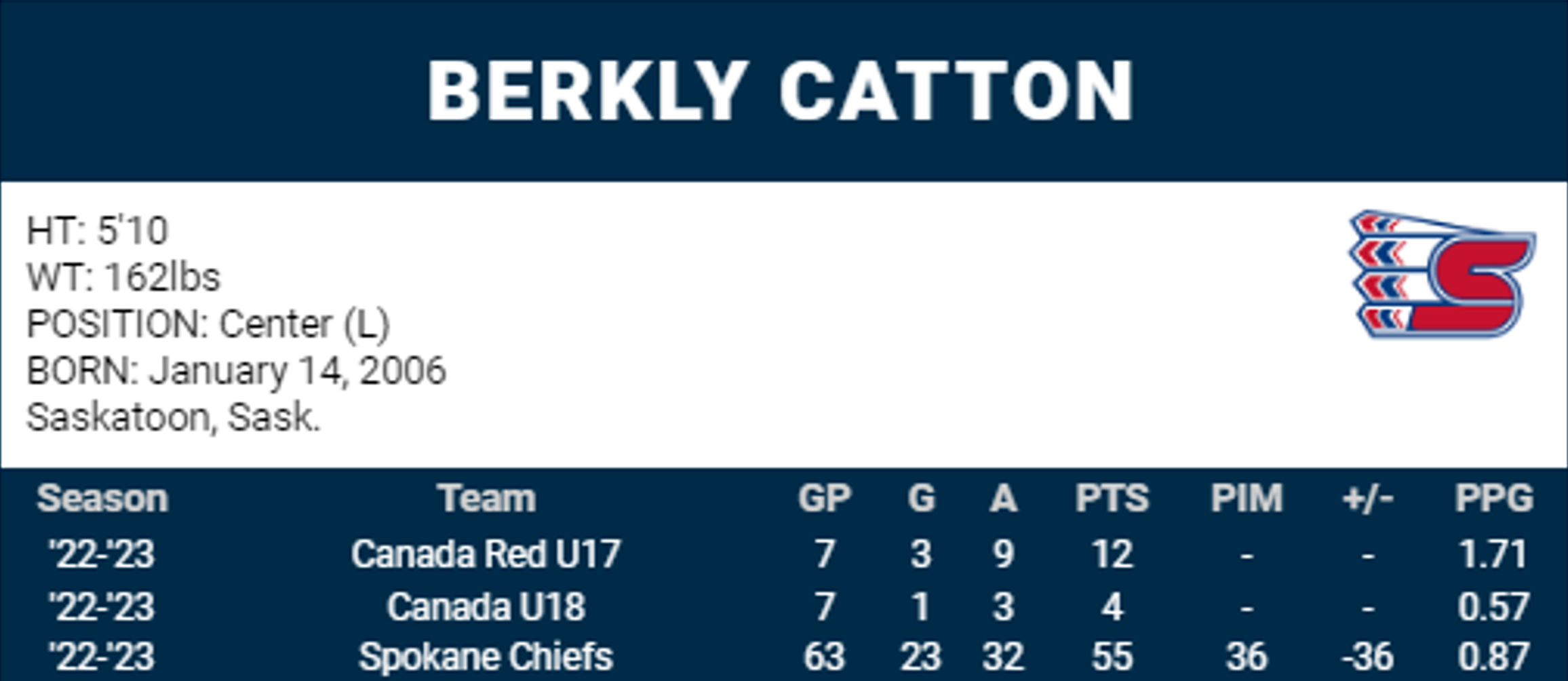 Scouting Report: Catton is an elusive, offensive talent who's difficult to defend in tight quarters. When he gets a step in transition, he’s a massive threat to create and score. Catton’s element is clear. He has the potential to be a top line scorer as a pro someday. His off the puck detail and ability to elevate defensively on occasion will be monitored closely.