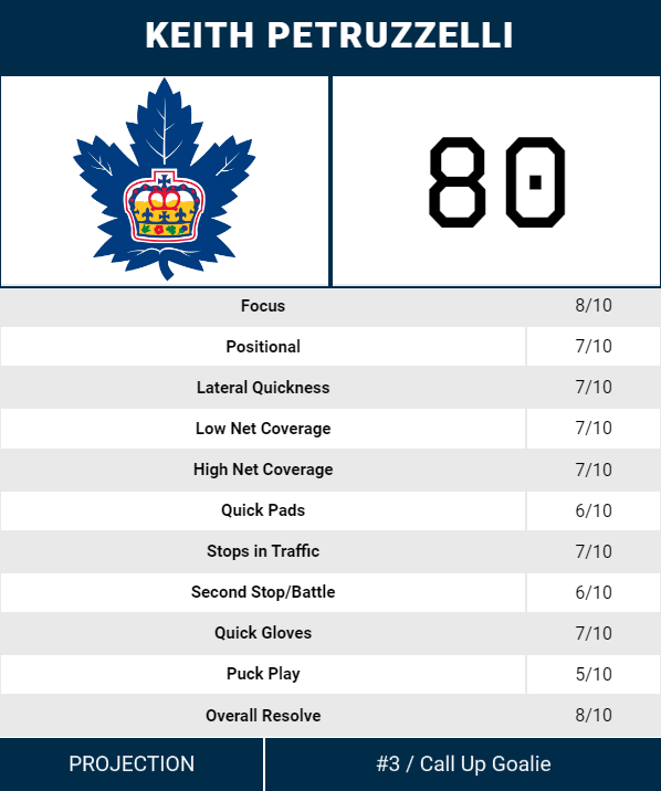 He is going to need to improve his lateral push/quickness for the NHL game. When moving side to side he is a bit lethargic-looking, but his mechanics are fine. Petruzzelli relies heavily on his stature (think Ben Bishop) more than his athletic ability.