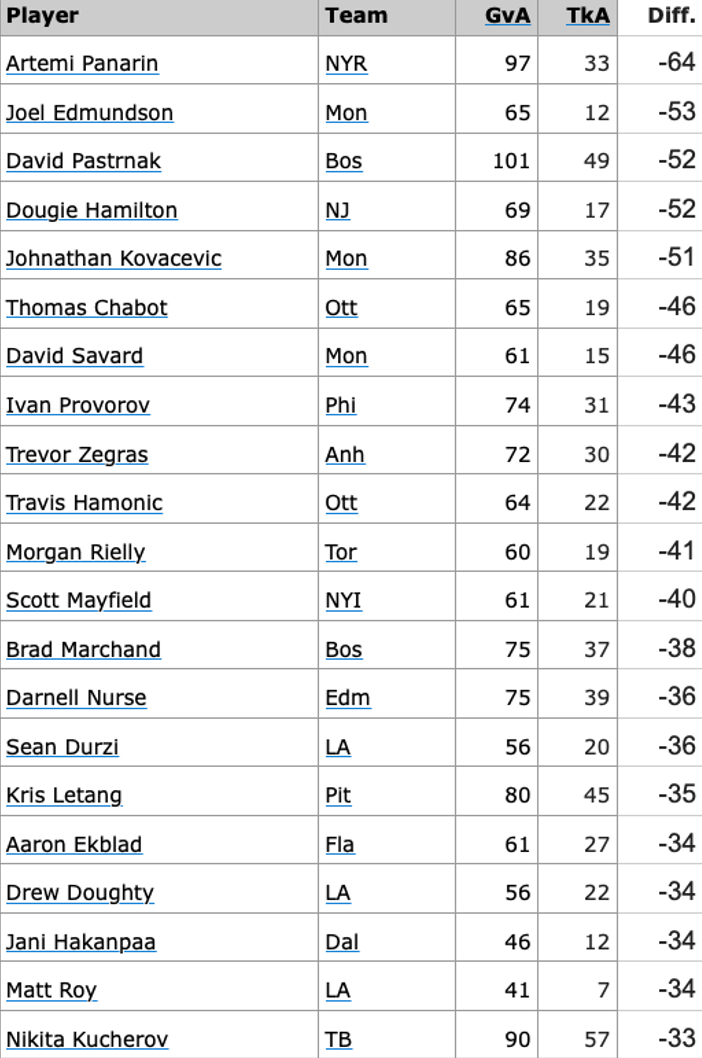 Here we naturally see a few more D-men, but it is fascinating that Artemi Panarin and David Pastrnak are this high up the list. Some of these players are the product of tougher scenarios (Morgan Rielly plays big minutes against top competition, as do guys like Aaron Ekblad, Dougie Hamilton, Drew Doughty, etc.), but I don’t think it’s a crazy coincidence that guys we think of as elite passers turn the puck over a lot. (It’s maybe more noteworthy they rarely get it back, though seeing Brad Marchand on the list does make me wonder about the Bruins' stat-keeper.)