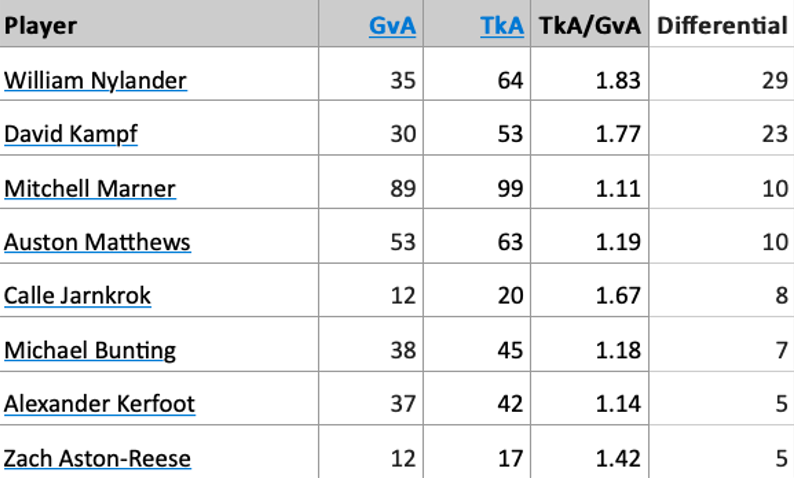 For the Leafs, their top turnover guy is Mitch Marner. He’s got the seventh-most in the whole NHL, but he’s surrounded on that list by names like Leon Draisaitl, Erik Karlsson, Jack Hughes and Nikita Kucherov. Marner also wins the puck back more than anyone in the league. Here’s a look at the Leafs' top guys in turnover to giveaway ratio: