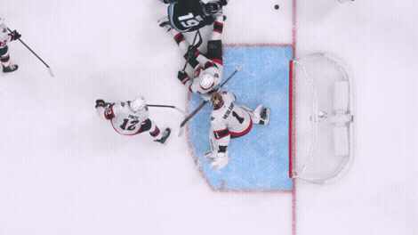 The situation: Midway through the second period of a 0-0 game, the Senators won an offensive zone faceoff and put pressure on the Predators. Brady Tkachuk was positioned at the top of Nashville's crease, outside of the blue paint. Tim Stutzle carried the puck into the slot, but after being stick checked and losing possession he continued into Nashville's crease on his own. Stutzle's skate made contact with goalie Juuse Saros' left pad in the blue ice and, immediately after, Jake Sanderson collected the loose puck and his shot beat Saros. The leg Saros would use to push off to challenge the shooter is the one Stutzle made contact with.