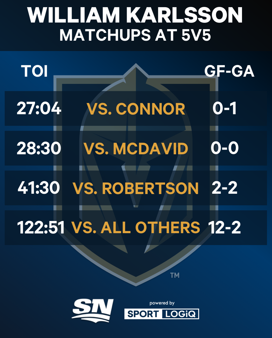 Karlsson’s 10 goals are a single-postseason franchise record, but his defensive performance has been equally if not more impressive. The Golden Knights have allowed five goals at 5-on-5 with Karlsson on the ice in the playoffs. As Vegas’ shutdown centre, Karlsson has locked down the likes of Kyle Connor, Connor McDavid and Jason Robertson through the first three rounds.