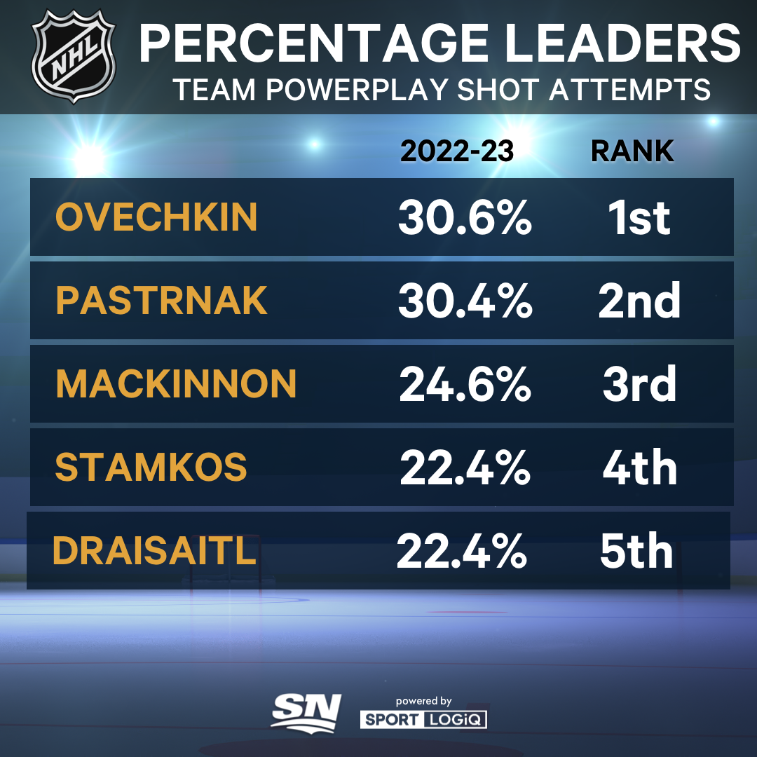 Ovechkin is going to get his looks from the left circle no matter what; he fired 110 one-timers on the power play last season, fourth most in the league behind Steven Stamkos (126), Mika Zibanejad (123) and David Pastrnak (115). Some variety would certainly help, though. Ovechkin accounted for 207 of the Capitals’ 677 power-play shot attempts last season (30.6 per cent) — the highest percentage of any player in the league.