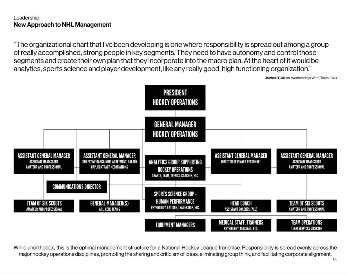 Gillis’s leaked pitch deck to be president of the Pittsburgh Penguins in 2021 — a gig that ironically went to Sundin’s final Leafs GM, Brian Burke — includes the following organization chart and stresses autonomy: