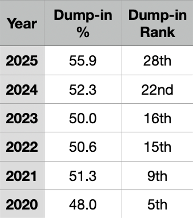 If we’re being honest, though, Sheldon Keefe had agreed with those traditionalists for a while about Toronto's need to play more north/south, evidenced by their “dump in rate” each season. Keefe took over in 2019-20, and here is Toronto's dump in rate by season since then. For ranking order, Sportlogiq considers the lowest dump-in rate as first.