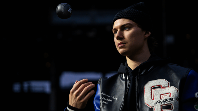 Sherwood sponsors a roster of hockey stars that includes Tkachuk, Alex DeBrincat, William Nylander, Emily Clark and Juraj Slafkovsky, but Bedard is the first of its athletes to play in the Winter Classic. After donning a sample version of the varsity jacket for a photoshoot, the Blackhawks centre asked Ingalls if he was going to be able to take it home. “Obviously he wants to take it with him, right?” the creative director says with a smile. They needed the sample for other photos, but Bedard did get a jacket of his own later on. He also got to wear the baseball glove and toss around the ball, which is hockey puck black.