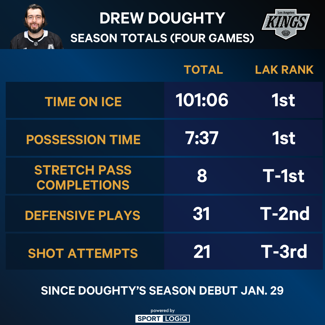 Doughty has shown few signs of rust. In his words, his passing has been “on point” over the past four games. He has completed eight of 10 stretch passes (80 per cent) and 51 of 63 outlet passes (81 per cent). Last season, he connected on 68.2 per cent of his stretch passes and 76 per cent of his outlet passes.