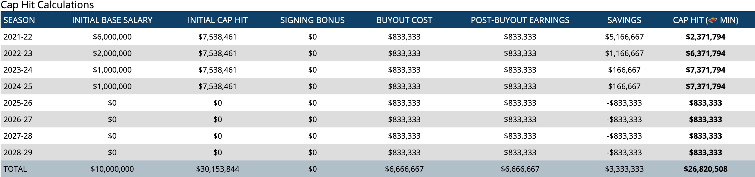 What buying out both Parise and Suter does is save $10.33 million in cap space for the coming season and also open up two extra protection slots ahead of the Seattle expansion draft. Matt Dumba will no longer be a question mark and can be protected from the Kraken.