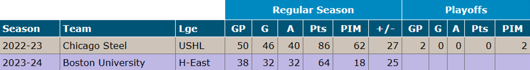 Here’s a look Bedard, Celebrini and McKenna’s stats before being drafted. Reminder that McKenna still has one season left to play before he's draft eligible. So his stats this season are more comparable to Bedard in 2021-22 or Celebrini in 2022-23:
