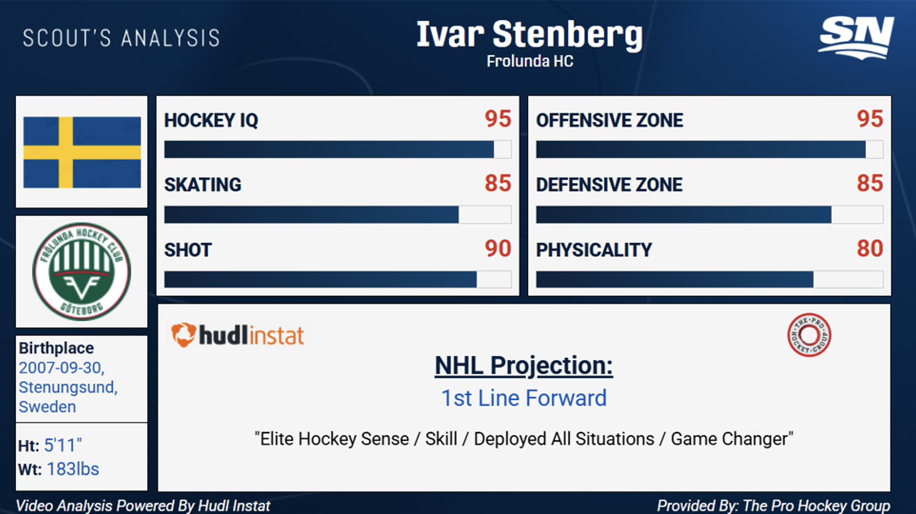 Stenberg’s three-zone detail is reliable. He never cheats the game defensively. Despite the fact his offence has been down recently, his plus/minus was even and he averaged 3.4 shots per game. His body of work this year has been exceptional. Stenberg has produced 11G-22A in 43 games playing in Sweden’s top pro league.