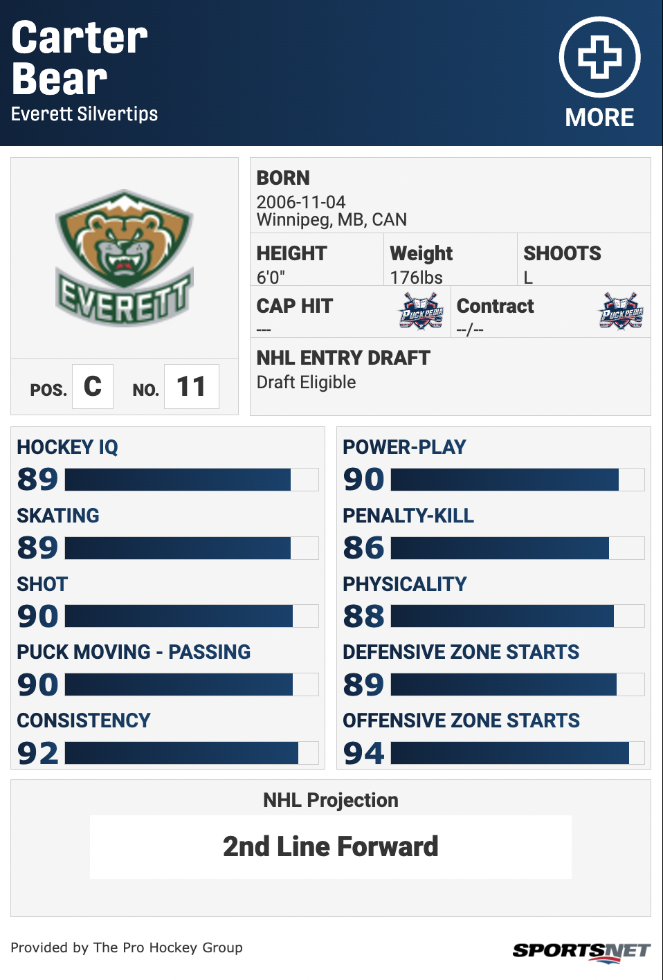 Bear is on pace to score over 100 points in the WHL this season. He's a lanky, skilled forward who has the hockey sense to be used in all situations. Bear moves well. He pursues opponents to create turnovers and can be a threat off the rush or in traffic areas in the offensive zone. Bear presents as equal parts shooter and distributor. He's a competitive player who gives all he has on a consistent basis.