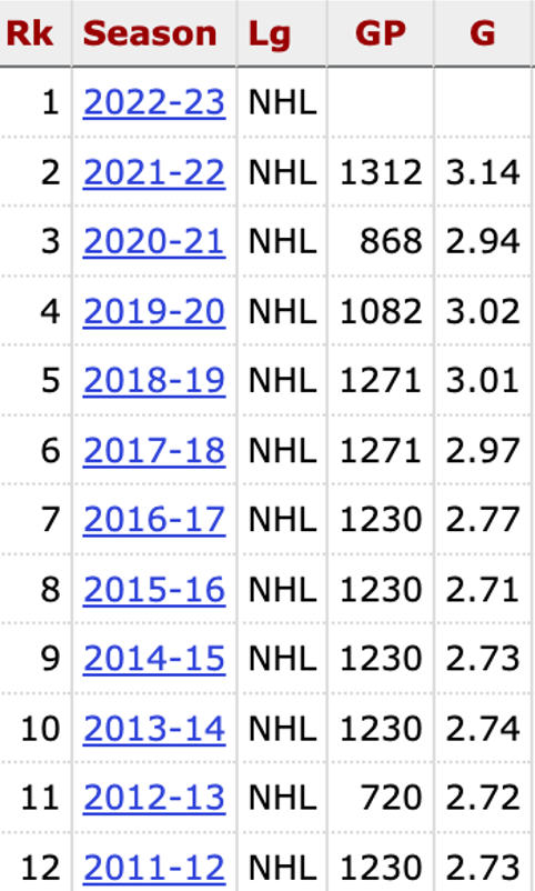 The NHL hadn’t seen a goals-per-game total like the one from 2021-22 since 1995-96, with teams averaging a total of 3.14 goals per game, for a combined total of nearly 6.3 goals per game. The early-to-mid-'90s was the end of the highest scoring era of hockey, and arguably one of the most exciting ones. As you can see, goals have been ticking up over the past 10 years, and really in just the past five or six: