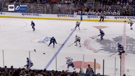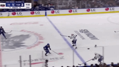 Watch Steven Stamkos give this away inside his blue line, before failing to clear it by shooting it directly into a Leafs forward: