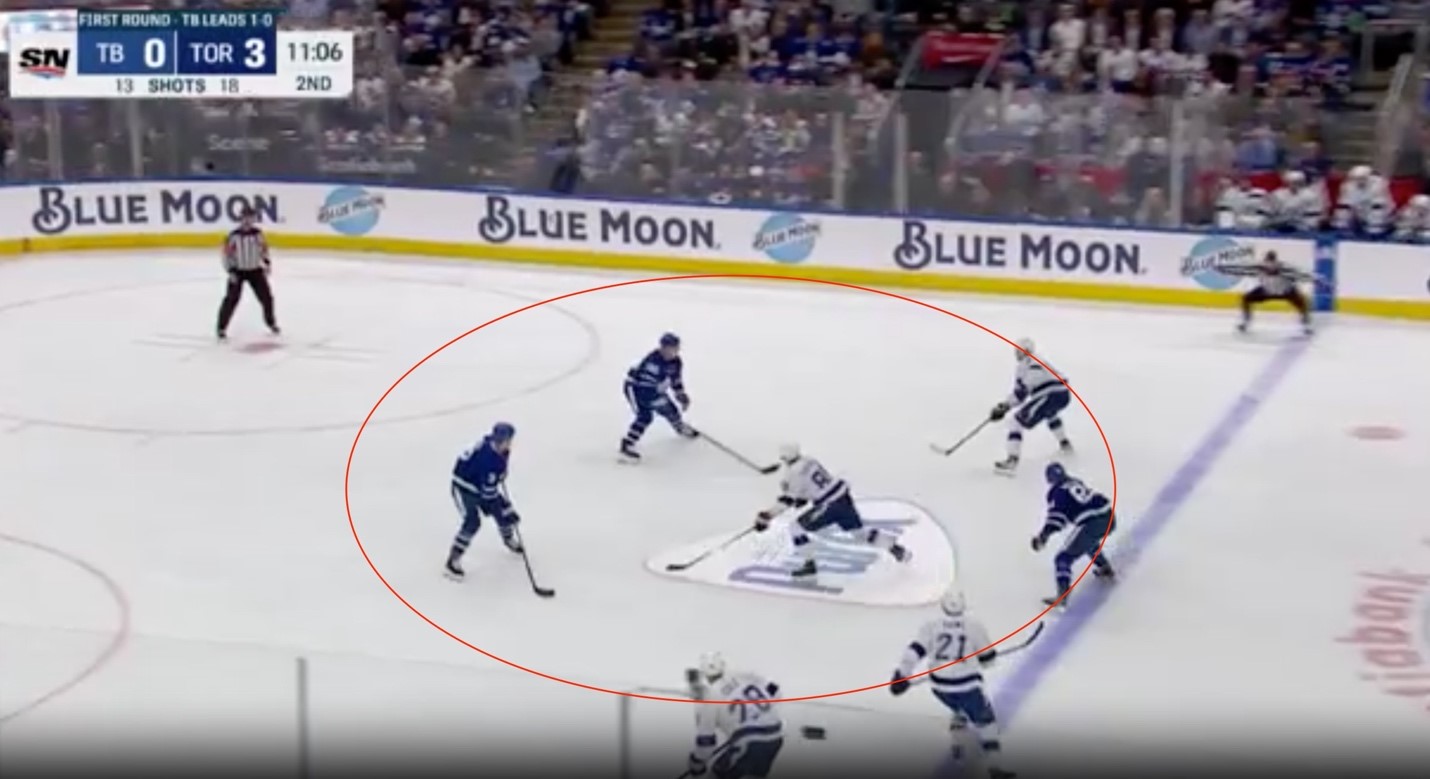 About 20 seconds later, after a line change, some Leafs vets come on the ice and make crucial plays. Morgan Rielly gets it up ice, but more than anything, John Tavares makes two cut-backs and hangs on to the puck. He doesn’t smash a dump-in, or try to beat the D one-on-one. It allows his teammates time to get involved, Rielly skates in on the offence, and suddenly after a tense shift in the Leafs end, they have a shift in TB’s end.
