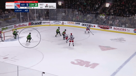The second clip is an example that shows Cowan being deployed on the penalty kill late in the first period in a playoff game versus the Kitchener Rangers. He starts the sequence by protecting his crease before moving out to block a shot in the last minute of the frame.