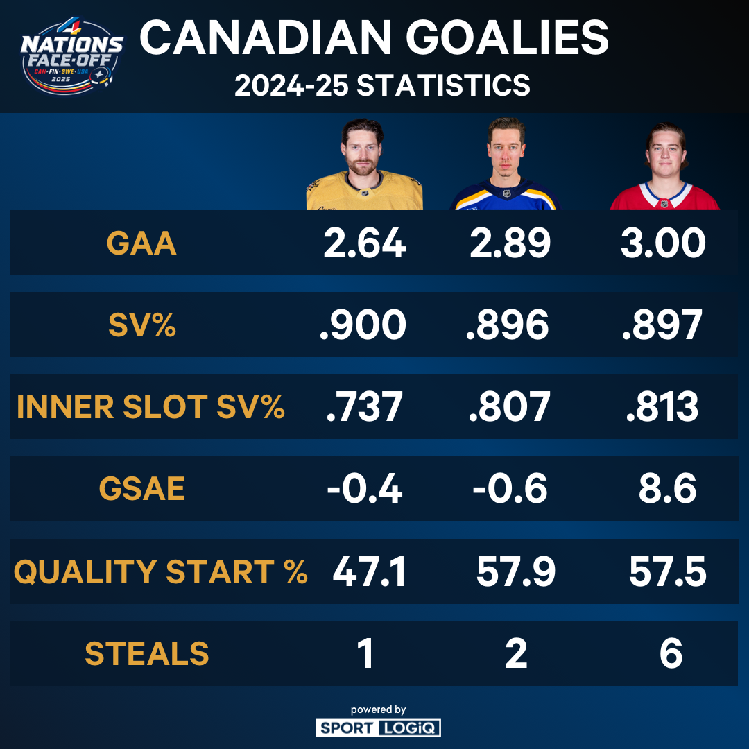 As for which goaltender gives Canada the best chance to win the 4 Nations Face-Off, the real answer is Logan Thompson, who said last month that the Canadian management group "never reached out to me." Thompson is having a Vezina Trophy-calibre season for the Washington Capitals with 26.2 goals saved above expected, trailing only Hellebuyck (27.9) and Anaheim’s Lukas Dostal (26.8). Thompson’s 80.0 QS% is second-best in the league behind Toronto’s Anthony Stolarz (83.3 QS%).