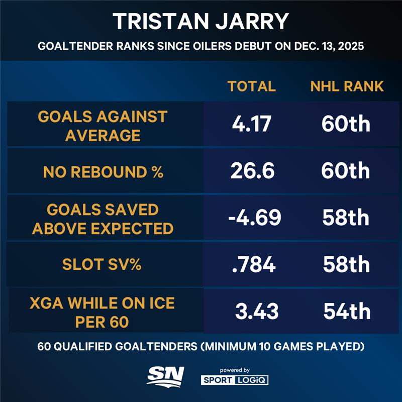 But since landing in Edmonton, Jarry has regressed significantly. He has surrendered 4.7 goals above expected and recorded four quality starts in 13 attempts (30.8 per cent). A goaltender earns a quality start when he saves more goals than expected.
