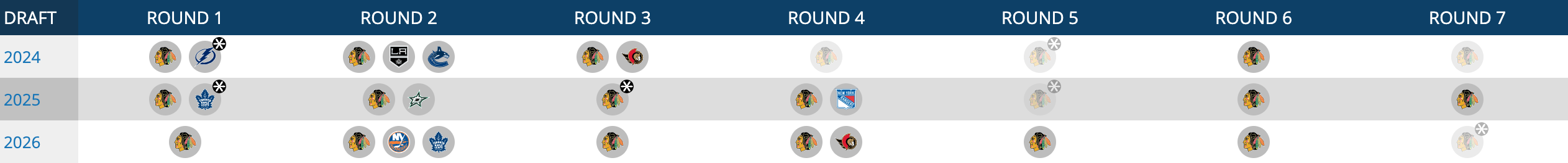 The Blackhawks’ draft grid is well positioned with five picks in the first two rounds. Their third-round picks will be slotted very early in the round as well. Chicago should end up with seven picks in the top 75 of the draft.