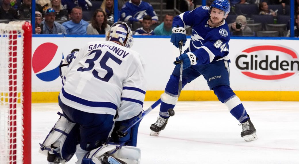 Tampa Bay Lightning winger Tanner Jeannot, seen here taking a shot on Toronto Maple Leafs goaltender Ilya Samsonov during Game 3, is likely out for Game 6. (Chris O'Meara/AP)