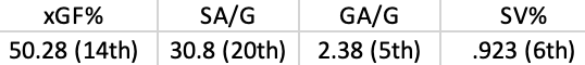 You can look at this two ways. One is that luck over-corrected a bit much on offence and they’ll settle in at something between their early-season average of four goals per game and their 2.00 average of late. The favourable Corsi measure is a nice sign, though the shots against creeping up is out of character for the team.