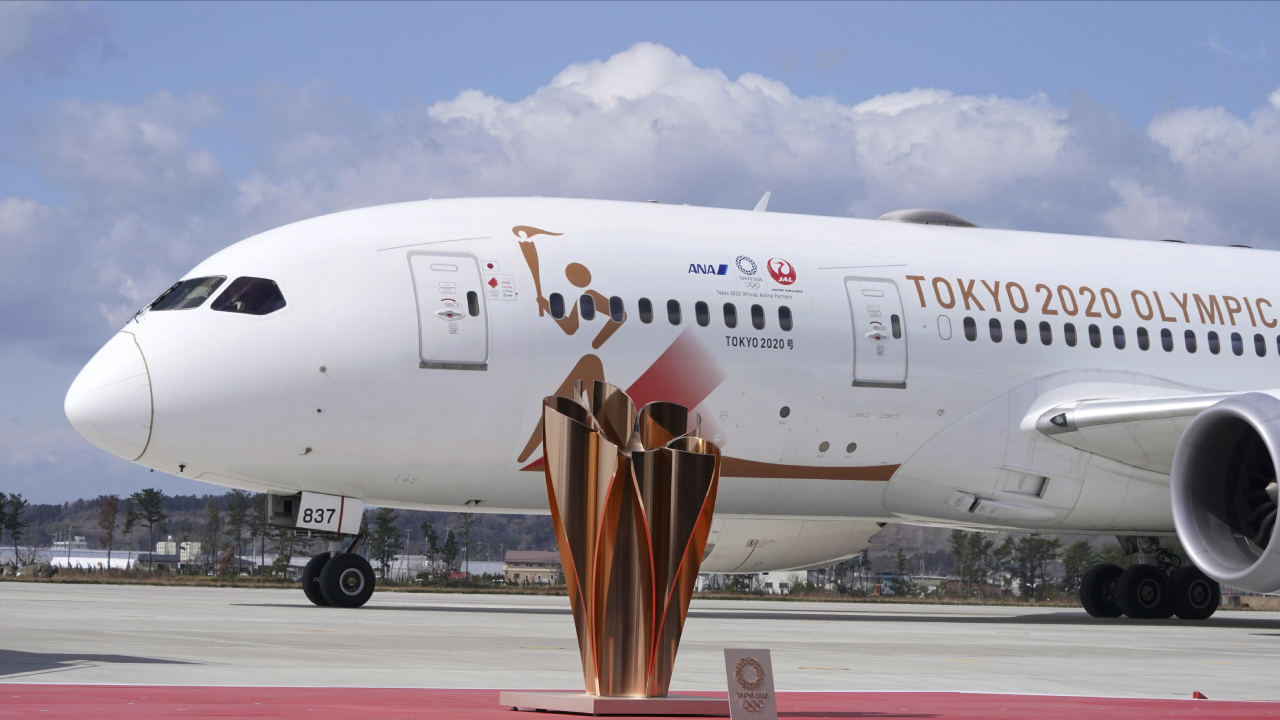 The flame, carried in a tiny canister from Greece, reached Japan aboard a white aircraft painted with the inscription “Tokyo 2020 Olympic Torch Relay” along its side. The tail section was adorned with the refrain “Hope Lights our Way.”