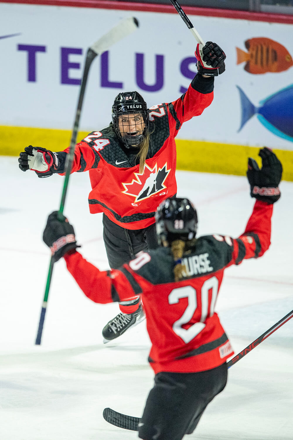 They’d met six years before that, at Spooner’s debut senior team training camp, which was held over Halloween. “I remember she dressed up like a giant baby,” Mikkelson says, laughing, her rookie teammate’s costume complete with a soother in her mouth and her hair in pigtails. “The other thing I remember about the first time we met is just the way she played. She’s Mach 10 out there all the time. She’ll skate through a brick wall. That peak intensity.