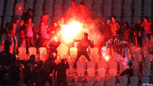 A group of about 200 hooded individuals were seated in a VIP section, next to the players’ tunnel. Some of them carried clubs and iron bars. They were confronted by a line of riot police on the other side of a trough, who they attacked at halftime.