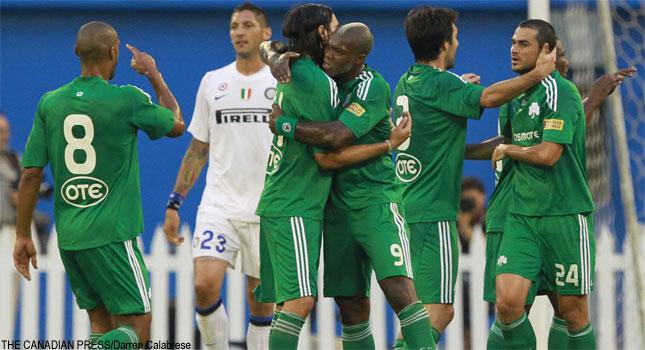 The heavily-tattooed French striker scored twice to lead Panathinaikos to a 3-2 victory over reigning European champions Inter Milan in an exhibition match in front of 17,169 fans at Rogers Centre.