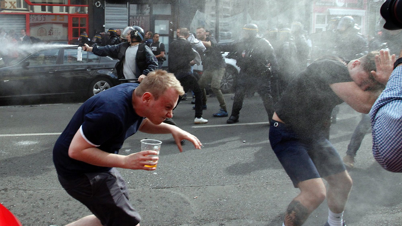 Police had to protect several thousand French soccer fans who had watched their team in an official fan zone set up for soccer lovers in each host city. Riot police formed a shield to keep rampaging England fans away, eventually charging the English, spraying tear gas at them and forcing them to flee.