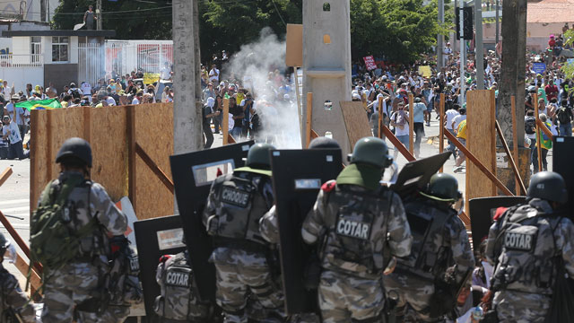 Riot police used gas bombs and pepper spray to keep protesters from advancing past a barrier some 3 kilometres (1.8 miles) away from the Arena Castelao in the northeastern city of Fortaleza.