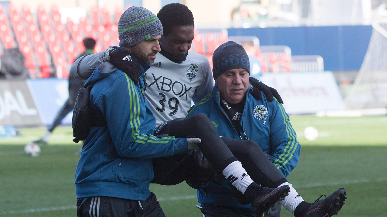 Two Sounders staff members carried the 21-year-old Saint Vincent and the Grenadines international off the BMO Field pitch after an apparent leg or knee injury.