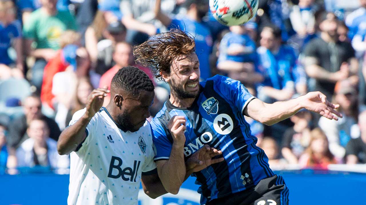 Vancouver responded with steady pressure and forced a free kick when Kyle Fisher took down Jacobson to the left of the Montreal goal. Cristian Bolanos’s shot was played out to the edge of the area where Jacobson lobbed a perfect volley over the crowd in front and under the crossbar for his first of the season.