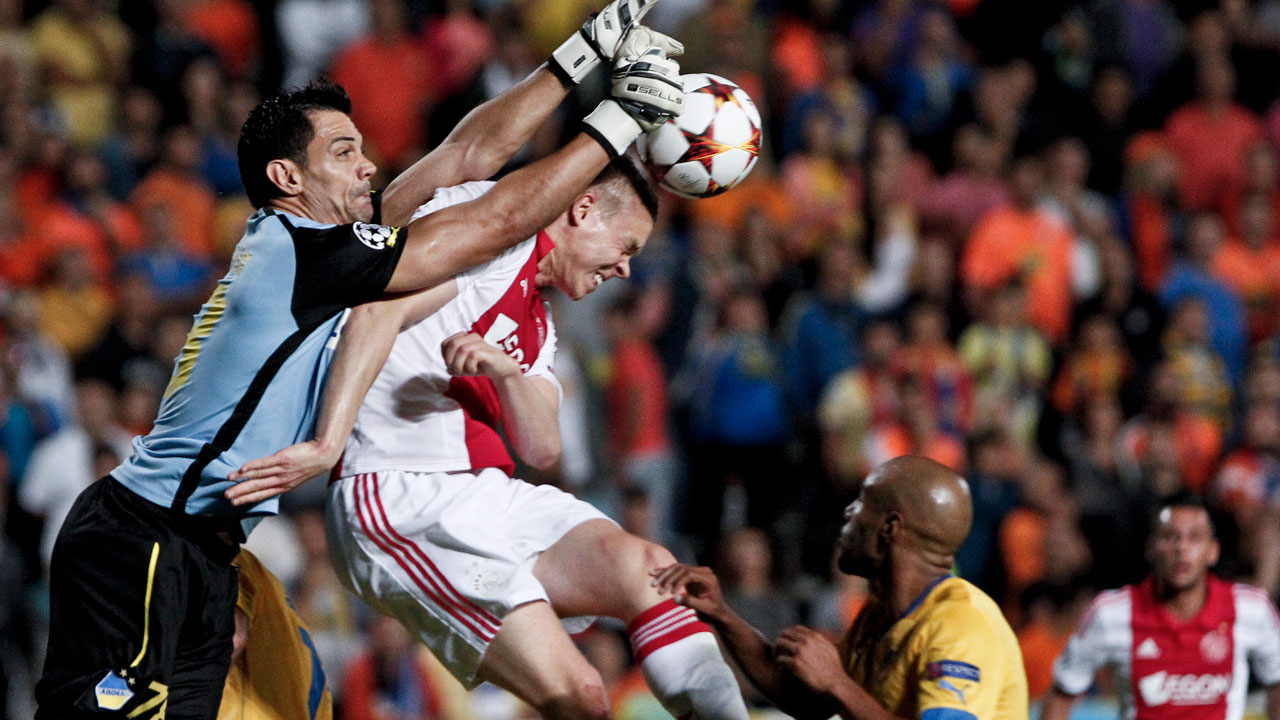 Apoel’s goalkeeper Urko Pardo, left, saves the ball behind Ajax’s Kolbeinn Sigthorsson. (Petros Karadjias/AP)
