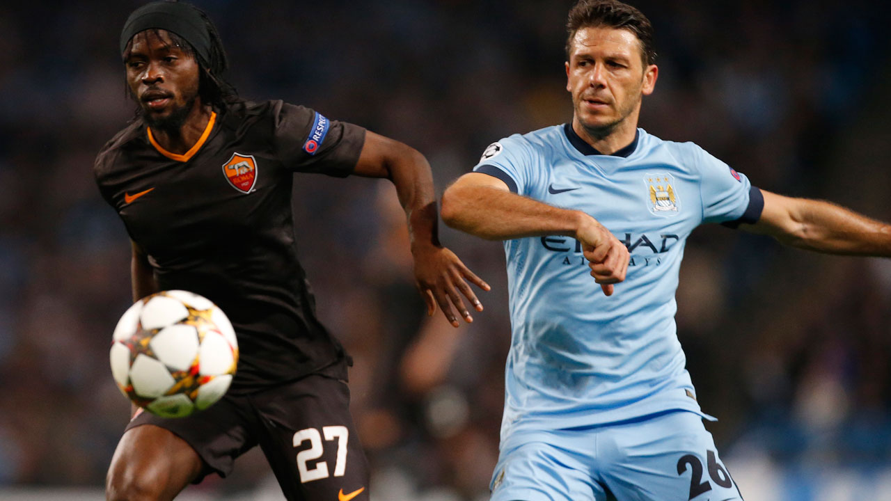 Manchester City’s Martin Demichelis, right, and Roma’s Gervinho battle for the ball. (Jon Super/AP)