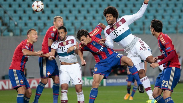 Bayern’s Dante, second right, heads the ball during the first half against CSKA Moscow. (Ivan Sekretarev/AP)
