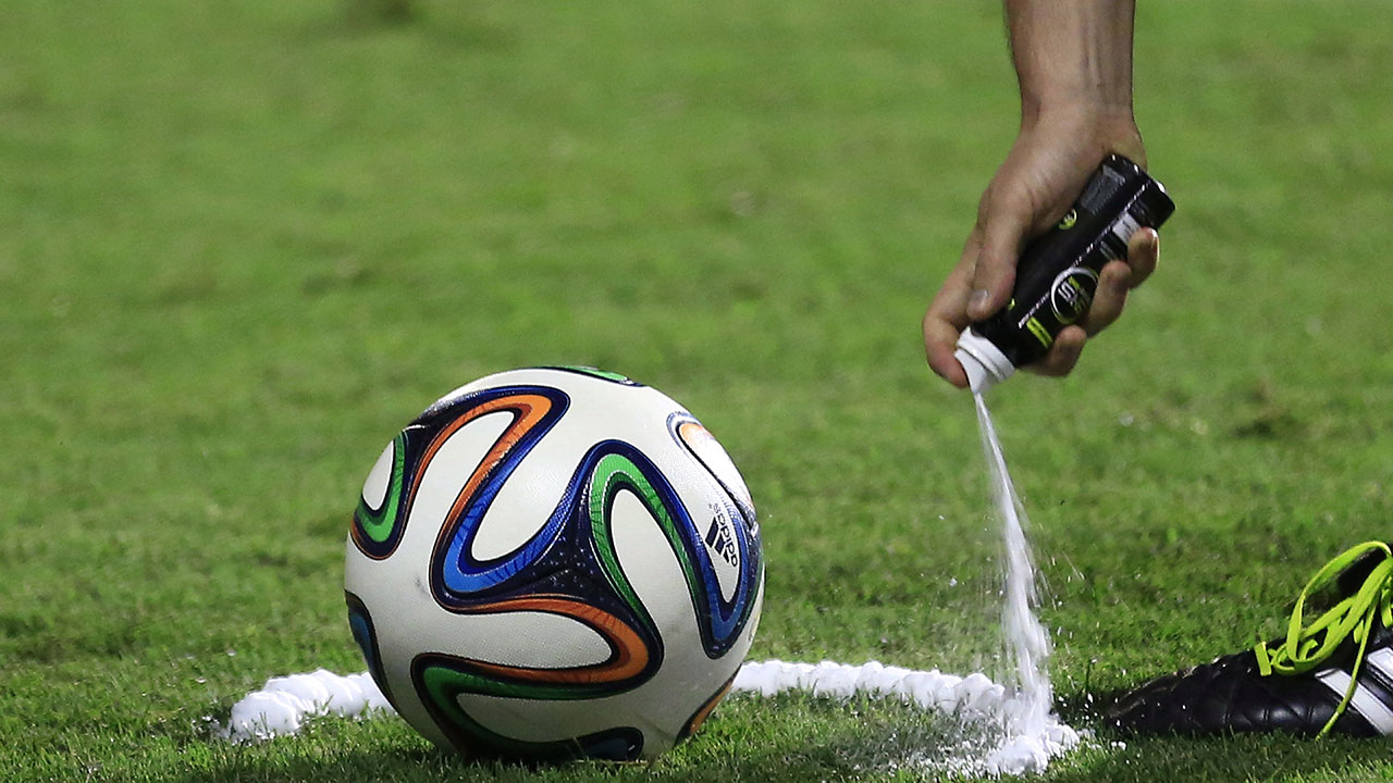 Referees mark a line on the grass 10 yards from the ball to stop defensive walls encroaching.
