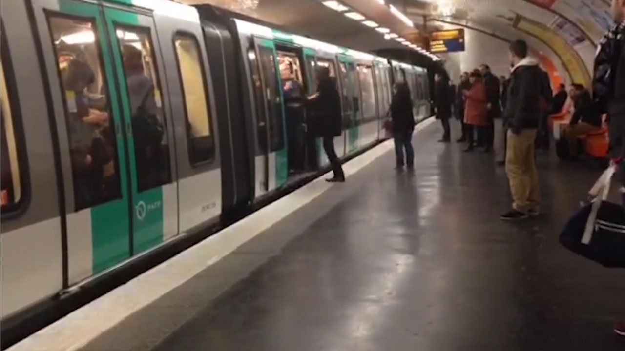 In a video posted by the Guardian newspaper, the man pushes back and says in French "Can I get on or what?" before again being shoved away.