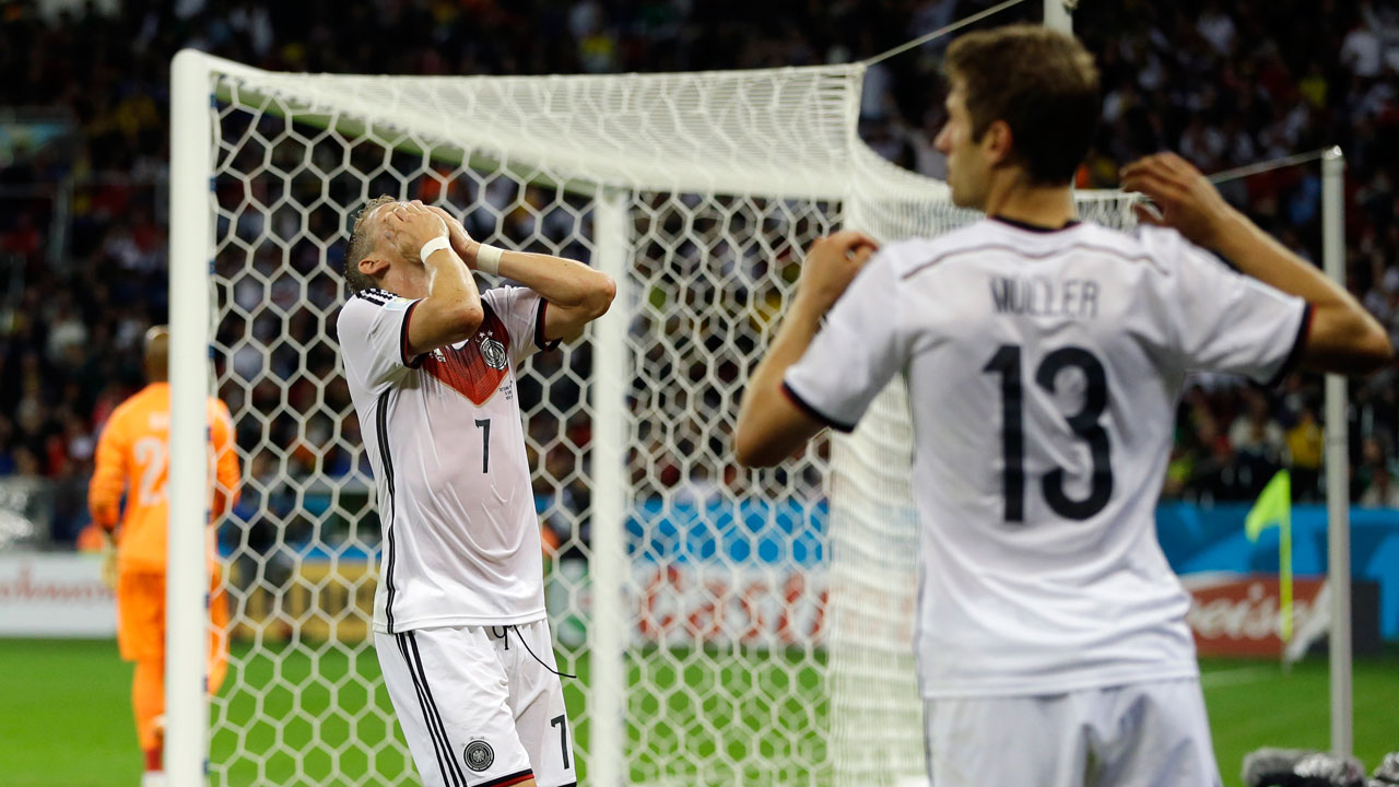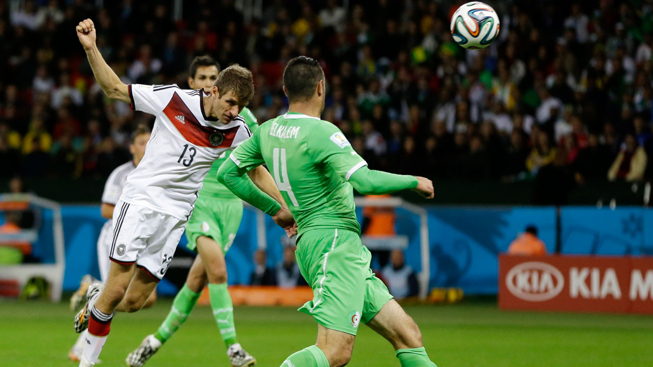 Germany's Thomas Muller reacts after missing a goal during the World Cup Round of 16 match between Germany and Algeria in Porto Alegre, Monday, June 30, 2014.