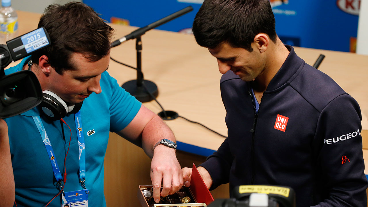 "I have a strict diet. This is only for you. You can have two if you like," he quipped during his pre-tournament performance, a repeat of his press conference before the 2014 Australian Open. "This is not bribery, just good spirits. A little delight. Why not!"