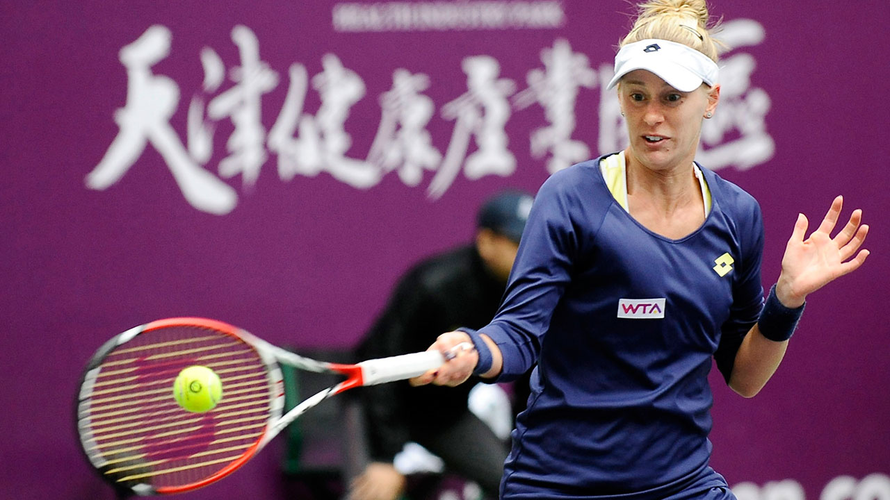 Alison Riske returns a shot against Belinda Bencic during the women's singles final at the Tianjin Open. AP Photo