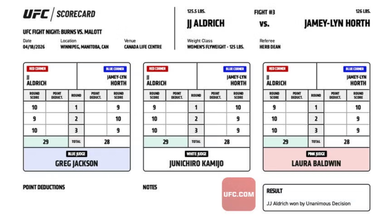 The live betting odds by the end of Round 3 had Horth as the projected winner, leap years ahead of JJ Aldrich after their 15-minute flyweight bout in Winnipeg. However, to the shock of Horth and the home fans, all three judges scored the contest for her American opponent.