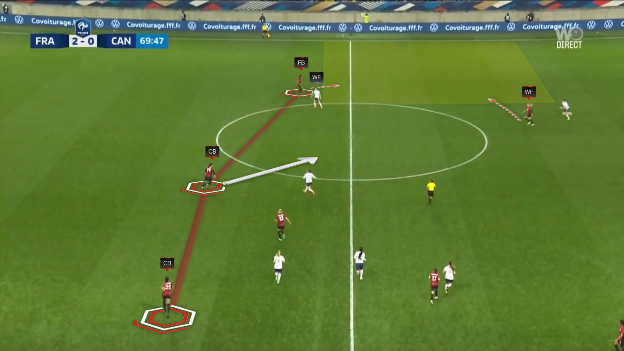 More often than not, Canada tends to bypass an opponent's high press by playing direct over the line of engagement, winning the second ball, then playing the ball into vacated space by the opposition's winger.