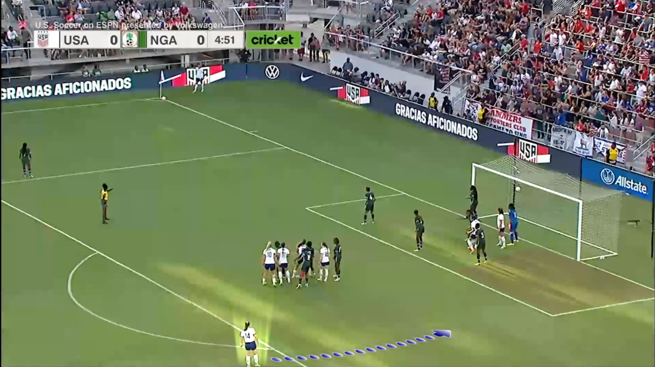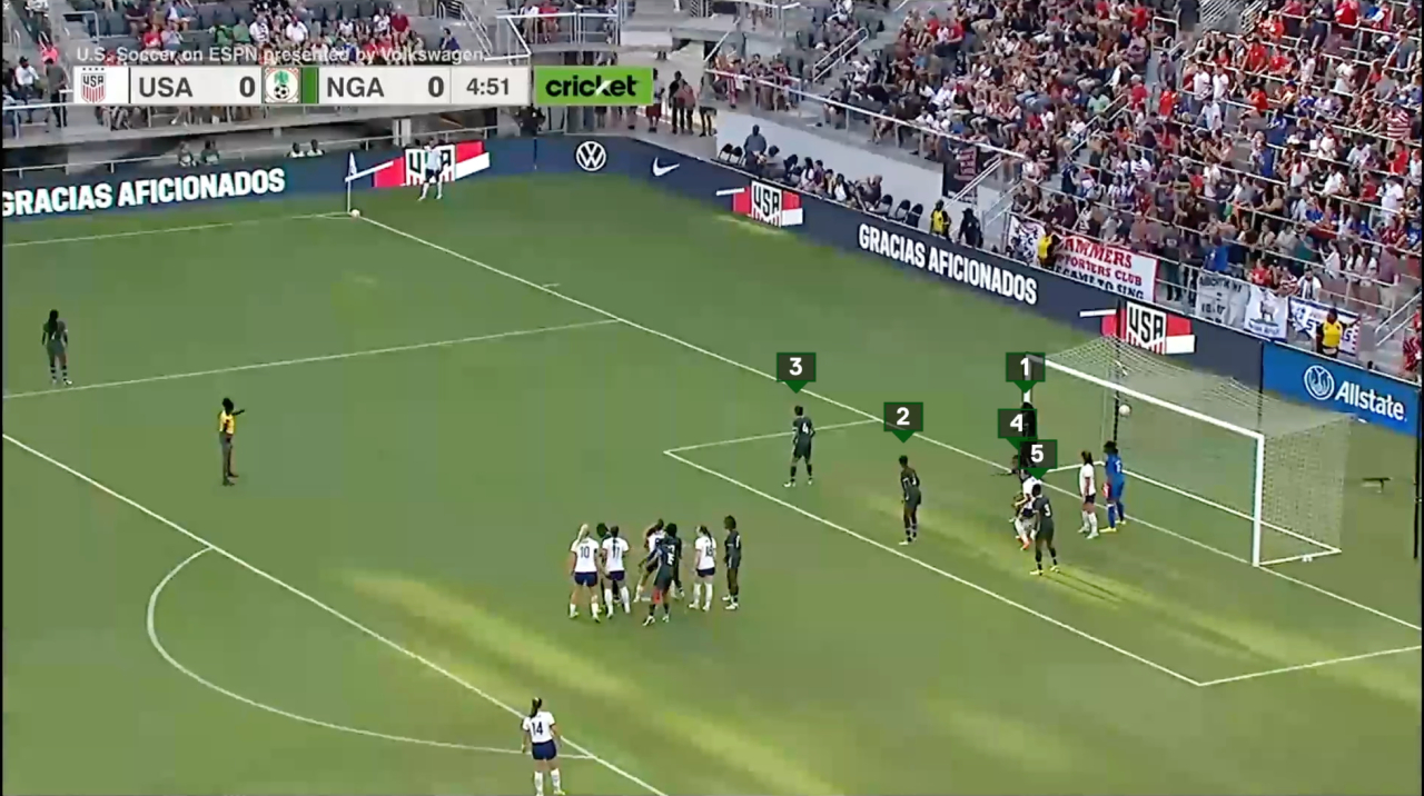 In this particular instance, there are five players in the six-yard box, but that's due to the two Americans occupying that space. Otherwise, there'd likely be the usual three. Regardless, there's still a clear route to the back post.