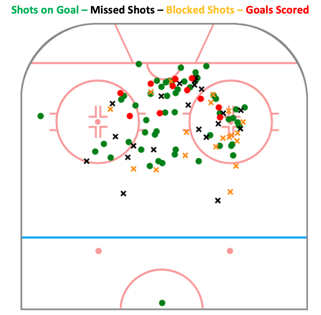 NHL teams value power forwards who take pucks to the middle of the ice and drive to the net. Carlsson’s shot map, over his past 25 games further confirms how he contributes in the offensive zone. There is nothing perimeter about his approach. He plays, and scores, between the dots in the offensive zone.